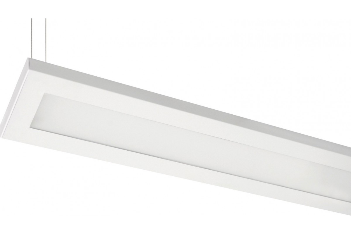 Offering efficient direct lighting, the suspended LED luminaire also features optional direct/indirect LG3-compliant versions to accommodate diverse visual comfort needs. Its durable steel housing, finished in a crisp white (RAL9003), presents a sleek and professional aesthetic that complements a wide range of interior styles.